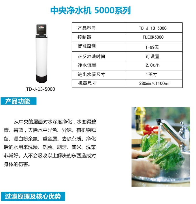全屋中央凈水機有效去除水中的異色、異味;進一步濾除水中微小雜質、膠狀體;去除水中的漂白粉余氯、農藥、重金屬;保留對人體有益的礦物質。使水變得碧清、碧藍,去除對人體有害的物質。