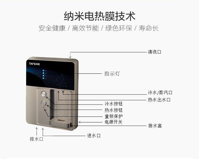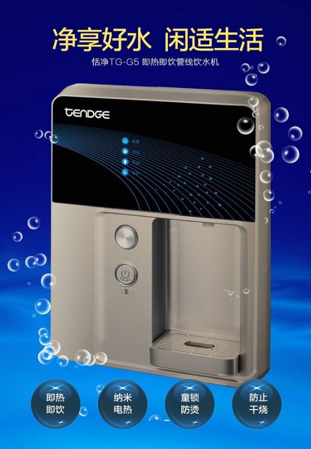 恬凈速熱管線飲水機TG-G5,采用納米電熱膜加熱技術,有效殺死水中的細菌微生物,防治二次污染。3秒速熱,隨時可喝上熱水。恬凈速熱管線飲水機TG-G5自帶防干燒系統與童鎖,安全省心。