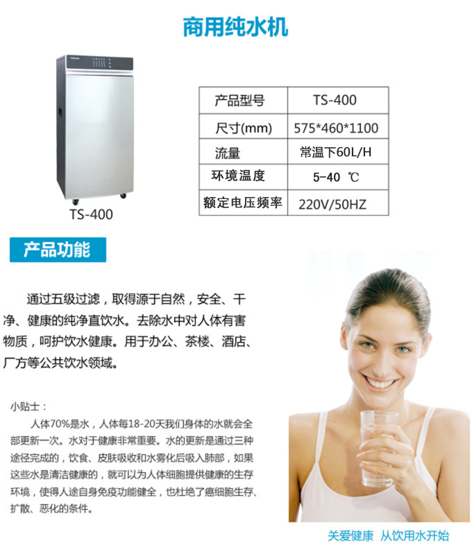 恬凈商用純水機可用于豪華別墅、辦公室、學校、茶樓等公共場所,解決公共飲水問題。恬凈商用純水機能夠去除水中所有有毒氣體及重金屬全部去除,水燒開再也不會結垢,口感甘甜,綿柔,讓飲用水更健康、更安全、更衛生。